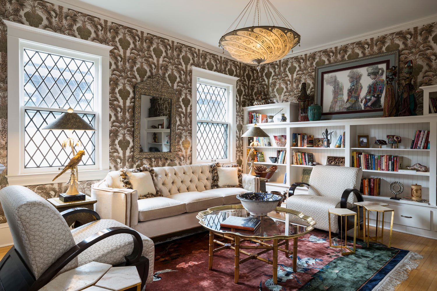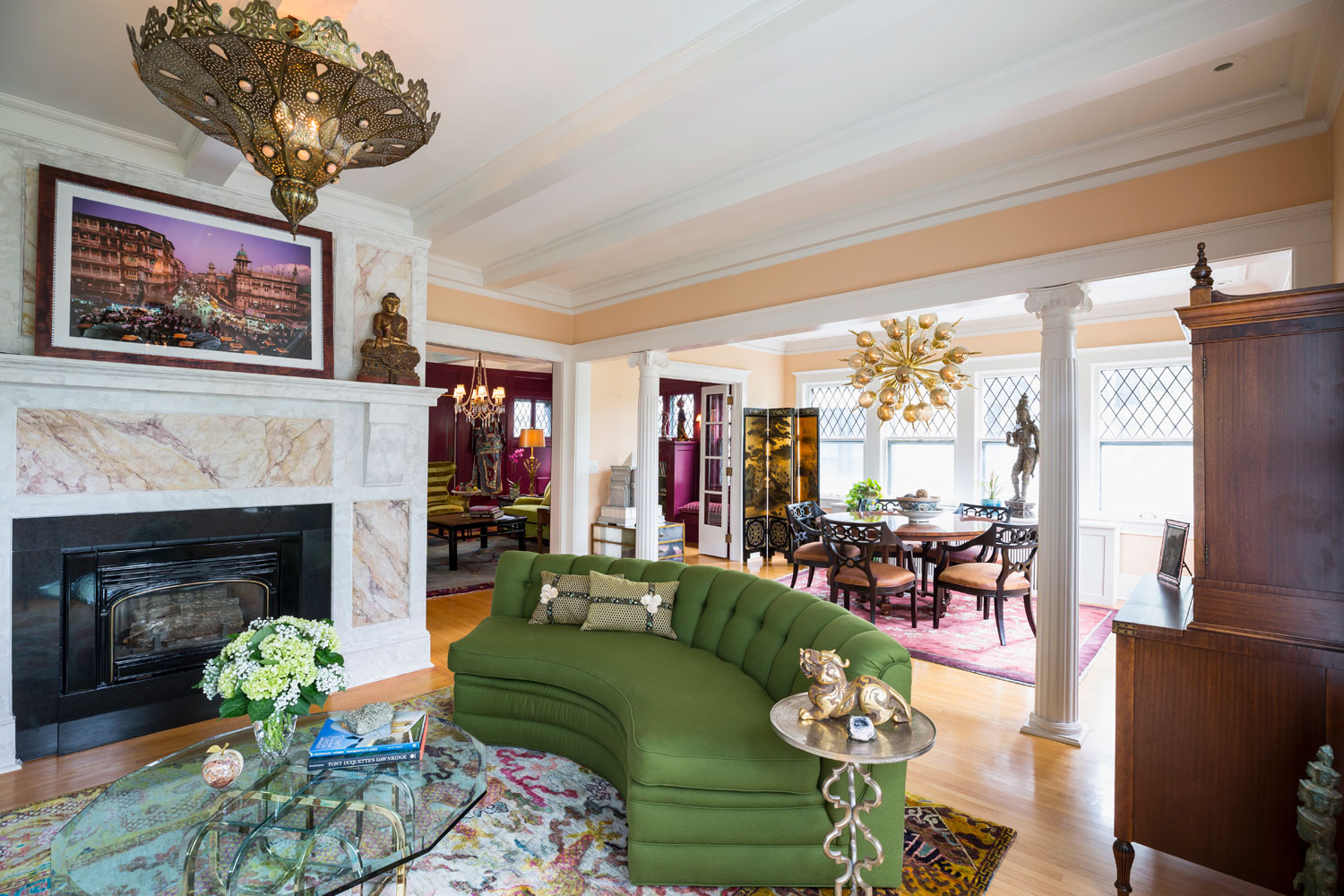 With a love of books over formal entertaining, the transformation of this old dining room into a glamorous merlot lacquered Library is just what the owner dreamt of. The rest of the home vibrates with a sumptuous elegance of decades gone by. Global treasures infuse the room with interest and the subtle sunset ceiling mural gives a permanent glow to the space.